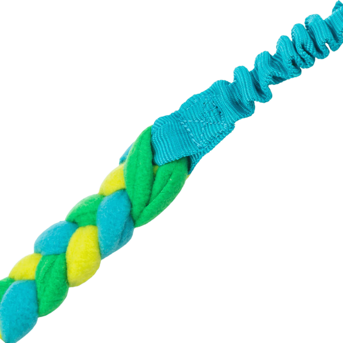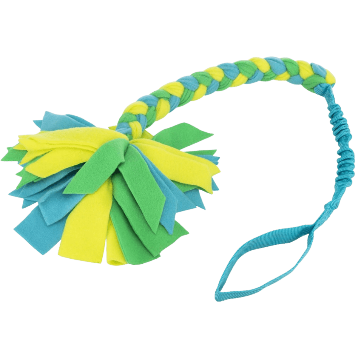 Leksaken Bungee Tugger är en härligt lekfull dragleksak för hundar. Utrustad med ett bekvämt handgrepp och flera mjuka, flätade fleeceband i ljusa pastellnyanser. Det elastiska bandet i blått ger extra följsamhet och minskar belastningen när hunden rycker och drar i leksaken. Passar utmärkt både för aktiva kastlekar och som motiverande belöning under träningspassen. Material: Fleece av polyester